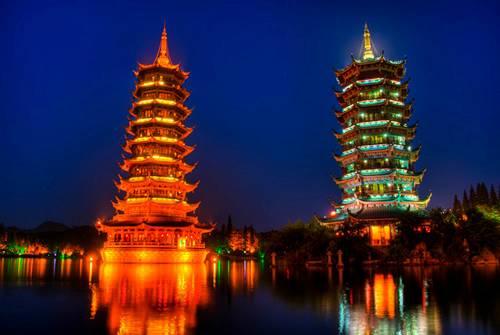 Sun and Moon pagodas are one of the most popular attractions of Guilin,located on Banyu Lake. Sun Pagoda, is the tallest copper pagoda in the world, 41 meters. And Moon Pagoda is 35 meters tall. The best time to visit the Sun and Moon pagodas of Banyu Lake, is at night, when they both light up in gold and blue.
