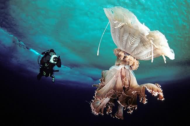 Real. A scyphomedusa, the largest plankton in Antarctic Ice, has tentacles over 9m in length and its bell can reach over 1m in diameter.