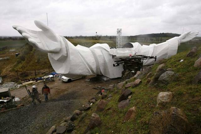 With construction nearing the end, engineers face the hazardous task of lifting the figure’s massive head and shoulders into place, which, officials say, might require the use of a helicopter.